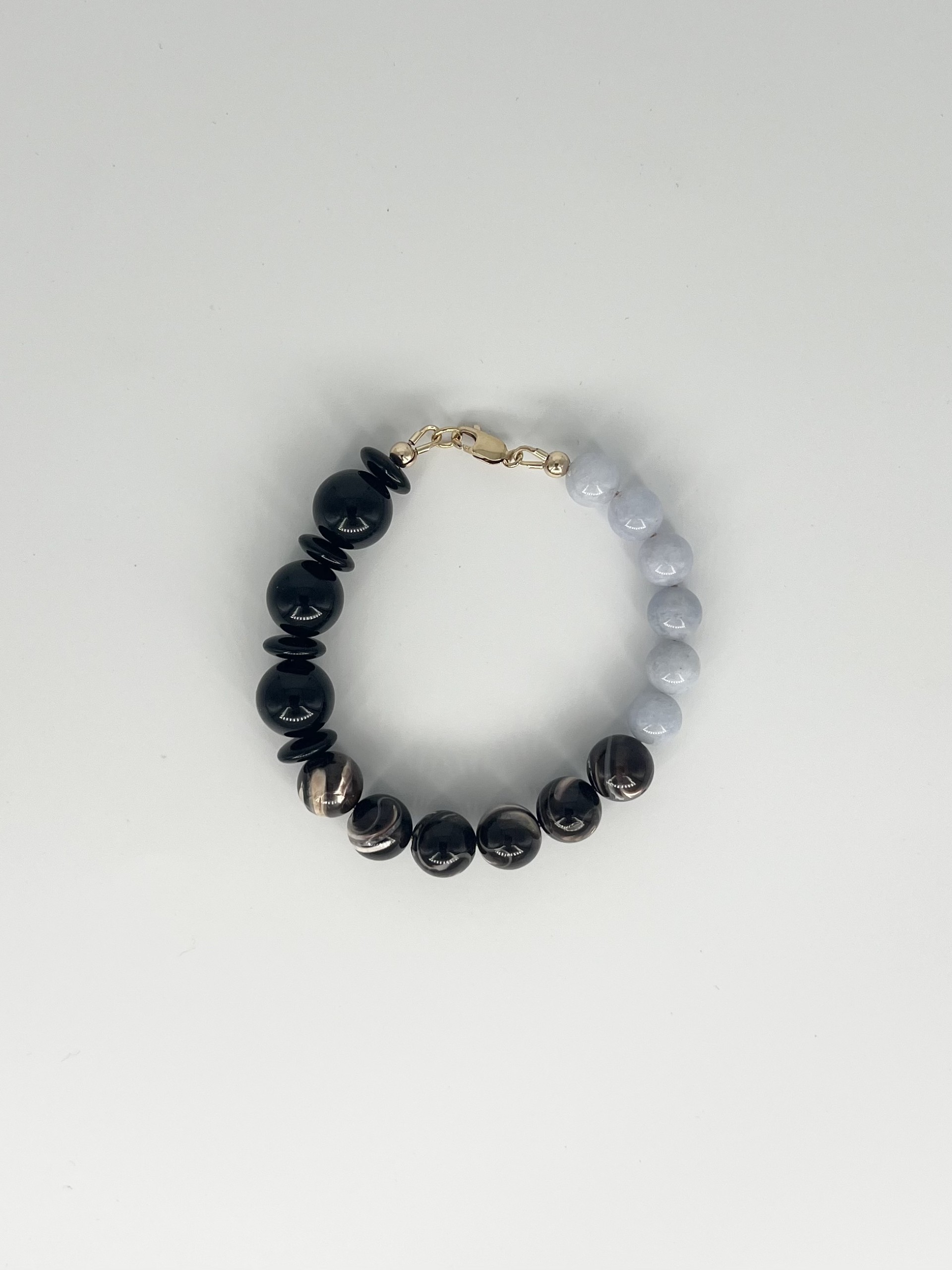 Aquamarine, Coffee Mother of Pearl and Black Onyx bead bracelet. Length – 7.5 inch A Mix of 8mm, 10mm and 12mm beads. Made using gold filled lobster clasp and connectors. All pieces are made by hand so each is unique. Some beads may have some natural imperfections. If you feel you require a different length then just contact me once ordered with the length needed. Please note this will affect the design slightly.
