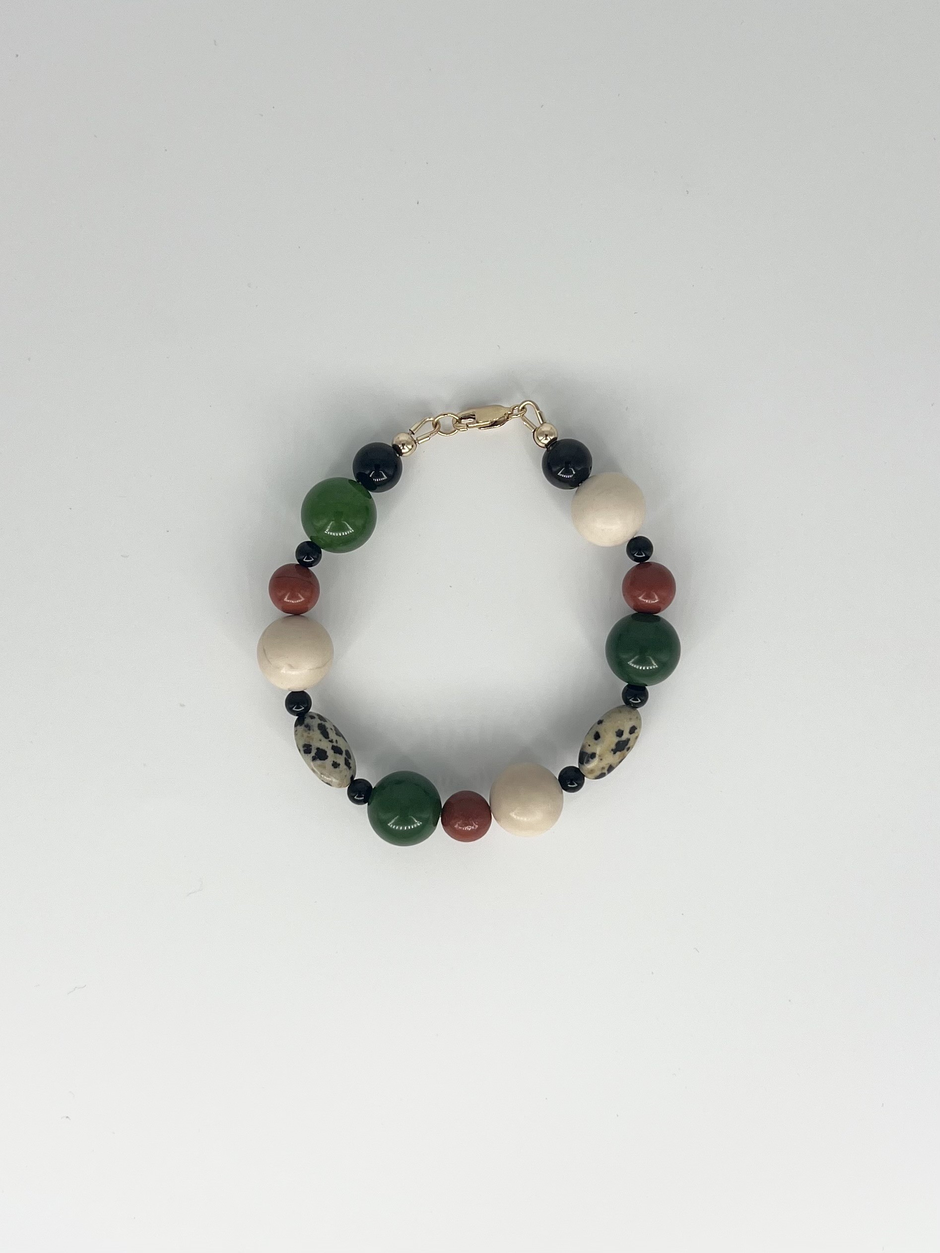 Oval Dalmatian Jasper, Red Jasper, Black Onyx, Green Malay and Ivory Jade bead bracelet. Length – 7.5 inch A Mix of 4mm, 8mm, 12mm and 14mm beads. Made using gold filled lobster clasp and connectors. All pieces are made by hand so each is unique. Some beads may have some natural imperfections. If you feel you require a different length then just contact me once ordered with the length needed. Please note this will affect the design slightly.