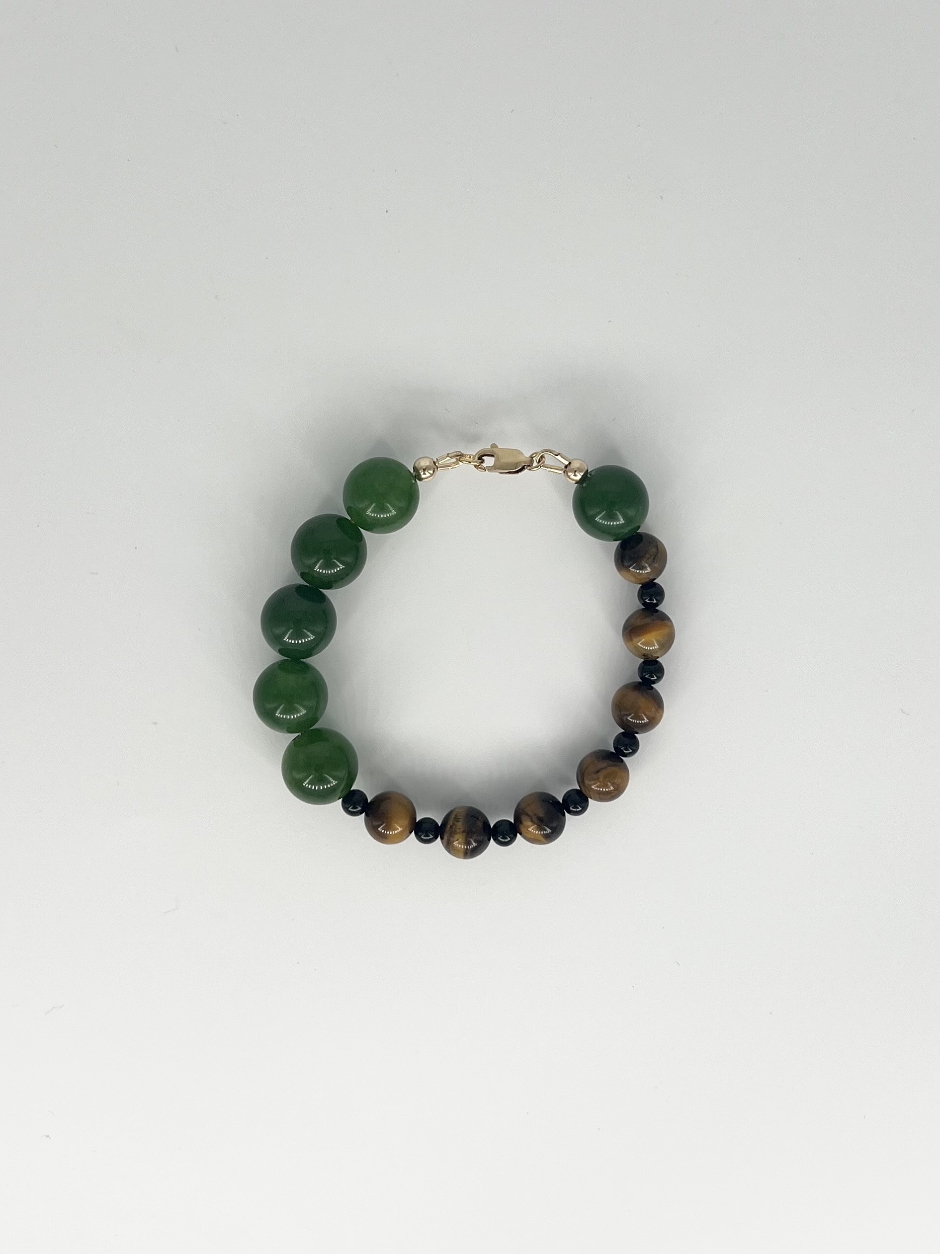 Green Malay Jade, Tiger Eye and Black Onyx bead bracelet. Length – 7.5 inch A Mix of 4mm, 8mm, and 12mm beads. Made using gold filled lobster clasp and connectors. All pieces are made by hand so each is unique. Some beads may have some natural imperfections. If you feel you require a different length then just contact me once ordered with the length needed. Please note this will affect the design slightly.