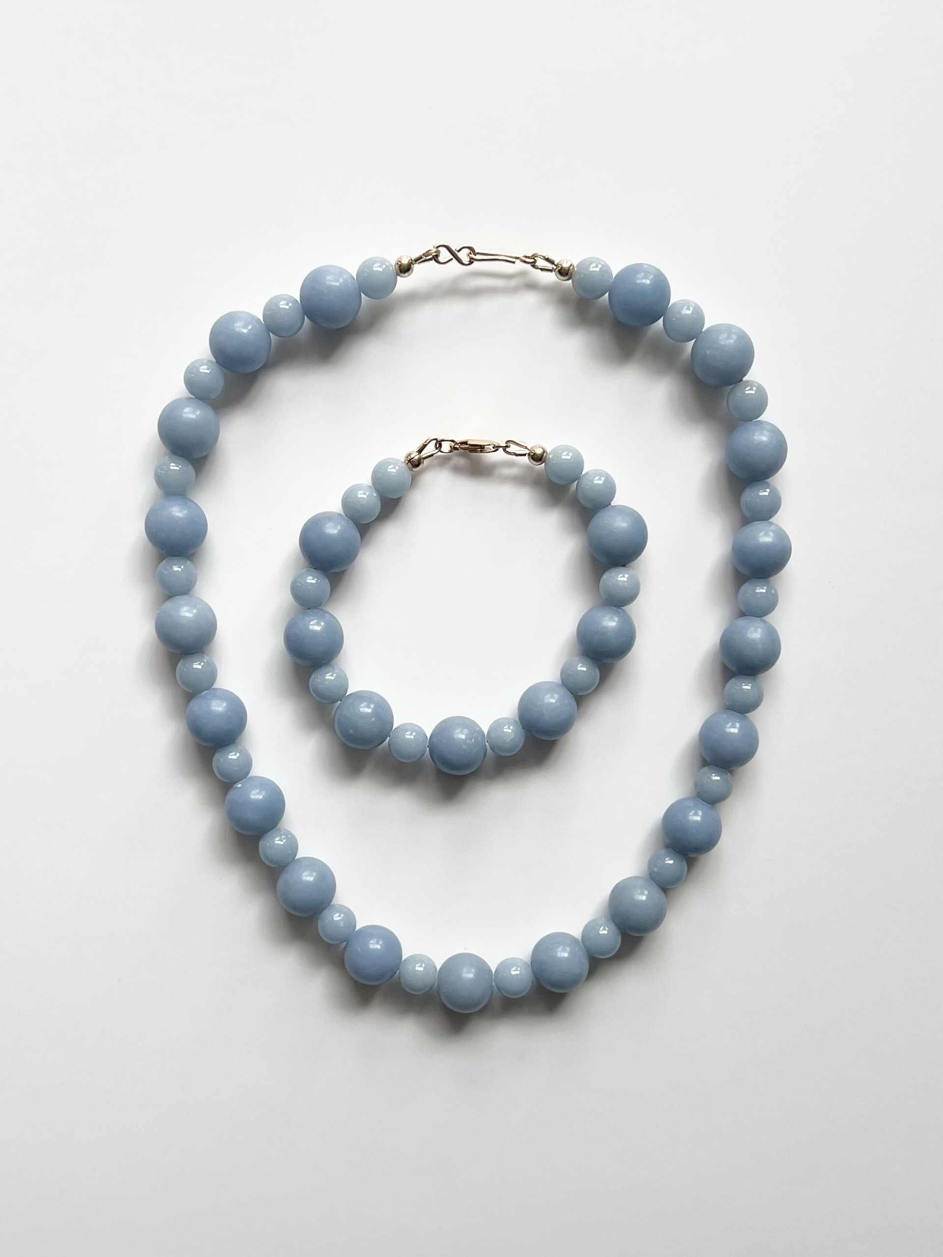 Blue Angelite semi-precious bead bracelet. Length – 7.5 inch approx. A Mix of 8mm and 12mm beads. Made using gold filled lobster clasp and connectors. Matching necklace available. All pieces are made by hand so each is unique. Some beads may have some natural imperfections. If you feel you require a different length then just contact me once ordered with the length needed. Please note this will affect the design slightly.