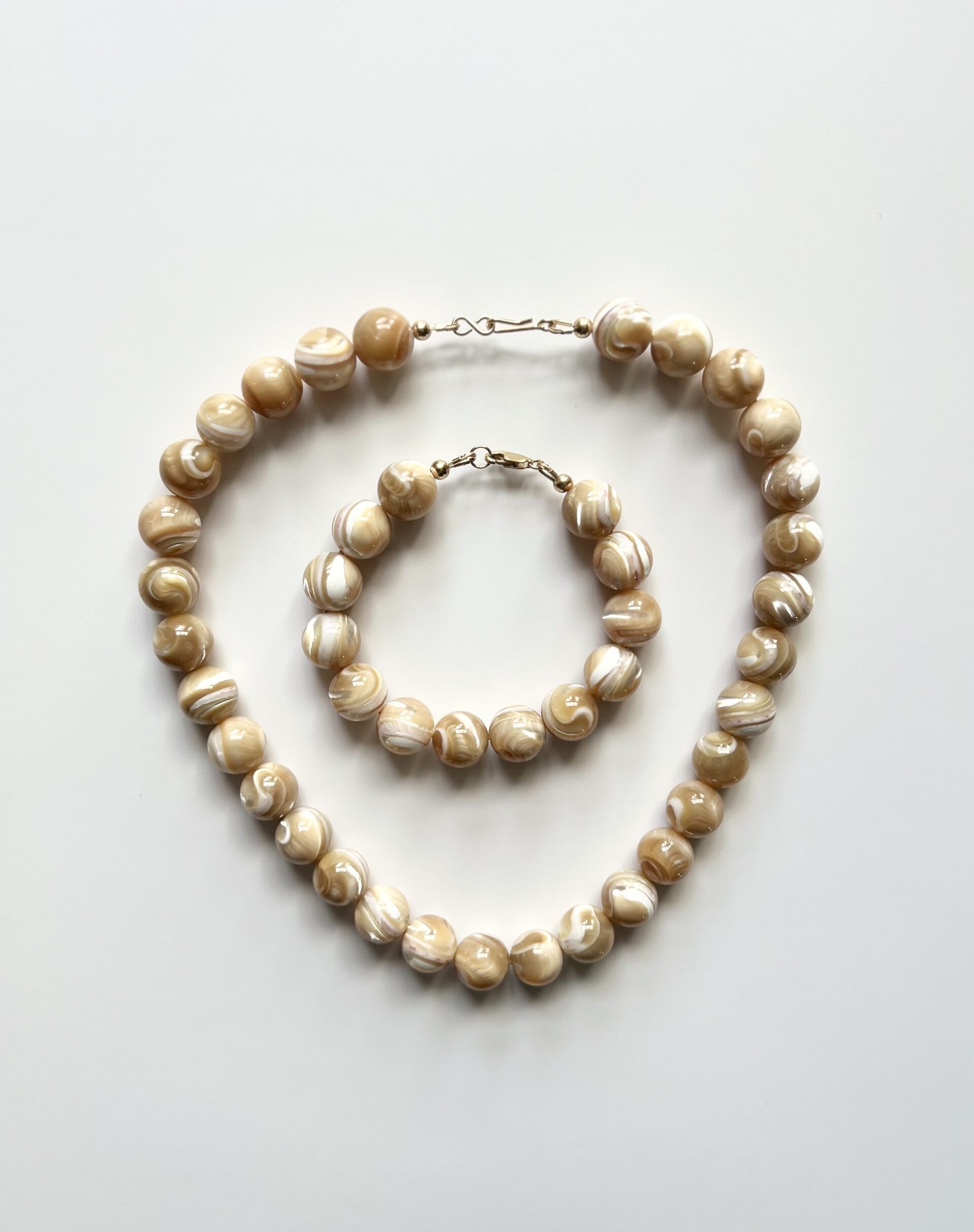 Caramel Mother of Pearl semi-precious bead bracelet. Length – 7.5 inch approx. Made using 12mm beads. Made using gold filled lobster clasp and connectors. Matching necklace available. All pieces are made by hand so each is unique. Some beads may have some natural imperfections. If you feel you require a different length then just contact me once ordered with the length needed. Please note this will affect the design slightly.