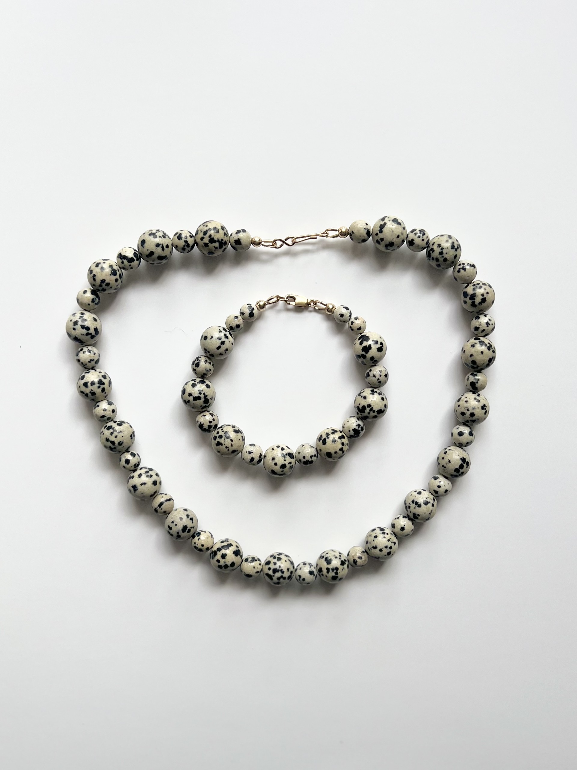Dalmatian Jasper semi-precious bead bracelet. Length – 7.5 inch approx. A Mix of 6mm, 8mm and 12mm beads. Made using gold filled lobster clasp and connectors. Matching necklace available. All pieces are made by hand so each is unique. Some beads may have some natural imperfections. If you feel you require a different length then just contact me once ordered with the length needed. Please note this will affect the design slightly.