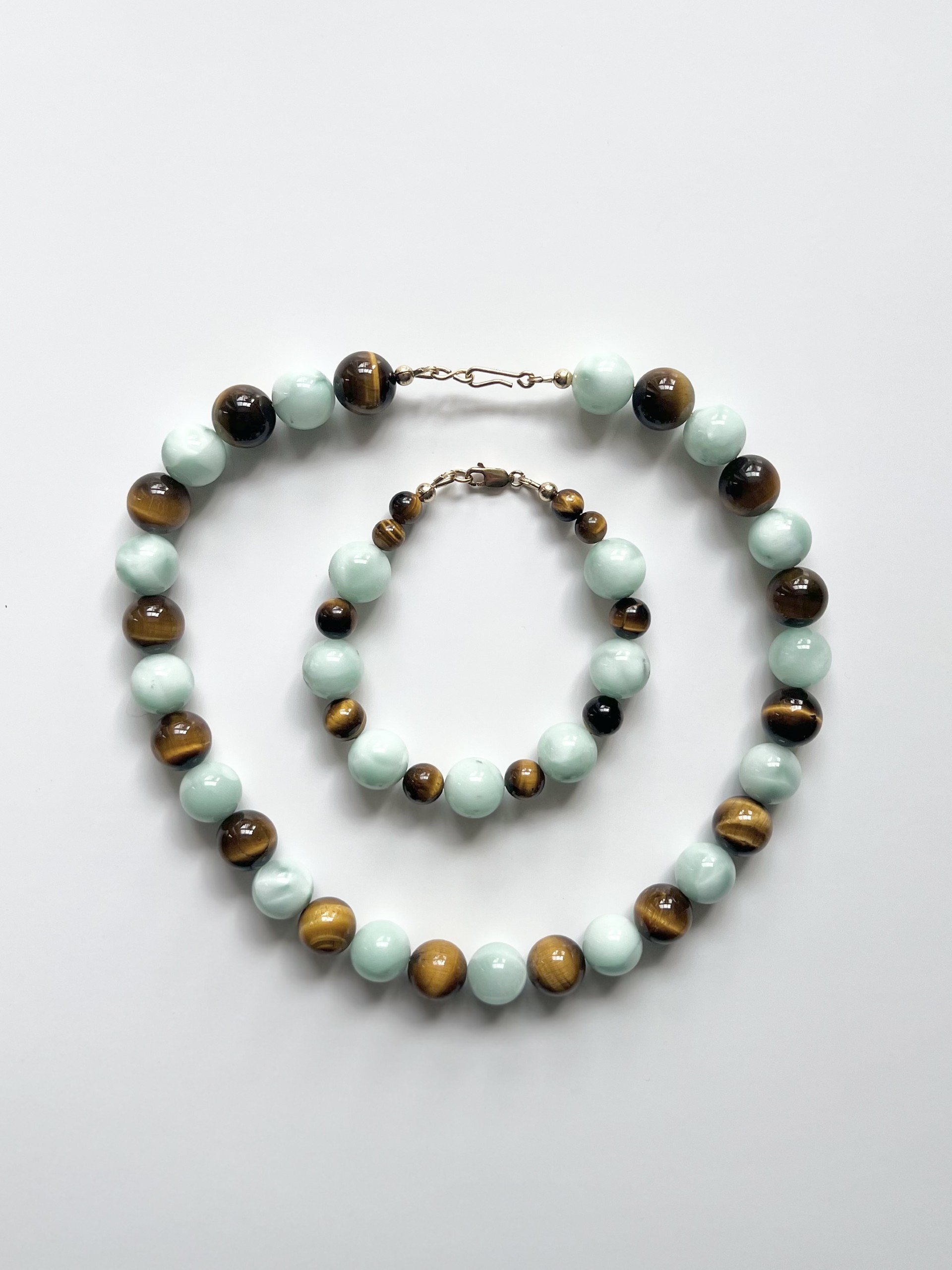 Green Angelite and Tiger Eye semi-precious bead bracelet. Length – 7.5 inch approx. A Mix of 6mm, 8mm and 12mm beads. Made using gold filled lobster clasp and connectors. Matching necklace available. All pieces are made by hand so each is unique. Some beads may have some natural imperfections. If you feel you require a different length then just contact me once ordered with the length needed. Please note this will affect the design slightly.
