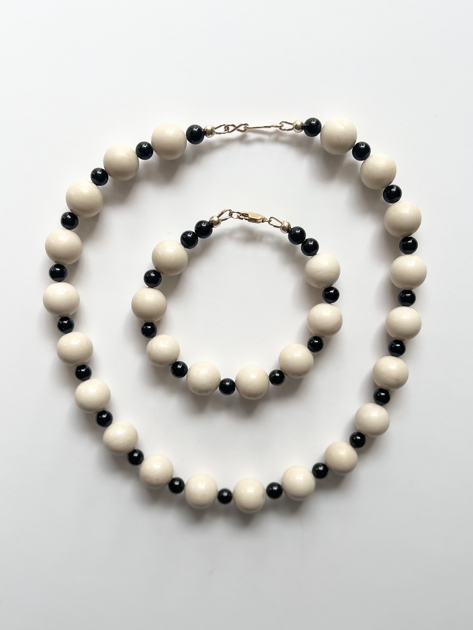 Ivory Jade and Black Onyx semi-precious bead bracelet. Length – 7.5 inch approx. A Mix of 6mm and 12mm beads. Made using gold filled lobster clasp and connectors. Matching necklace available. All pieces are made by hand so each is unique. Some beads may have some natural imperfections. If you feel you require a different length then just contact me once ordered with the length needed. Please note this will affect the design slightly.