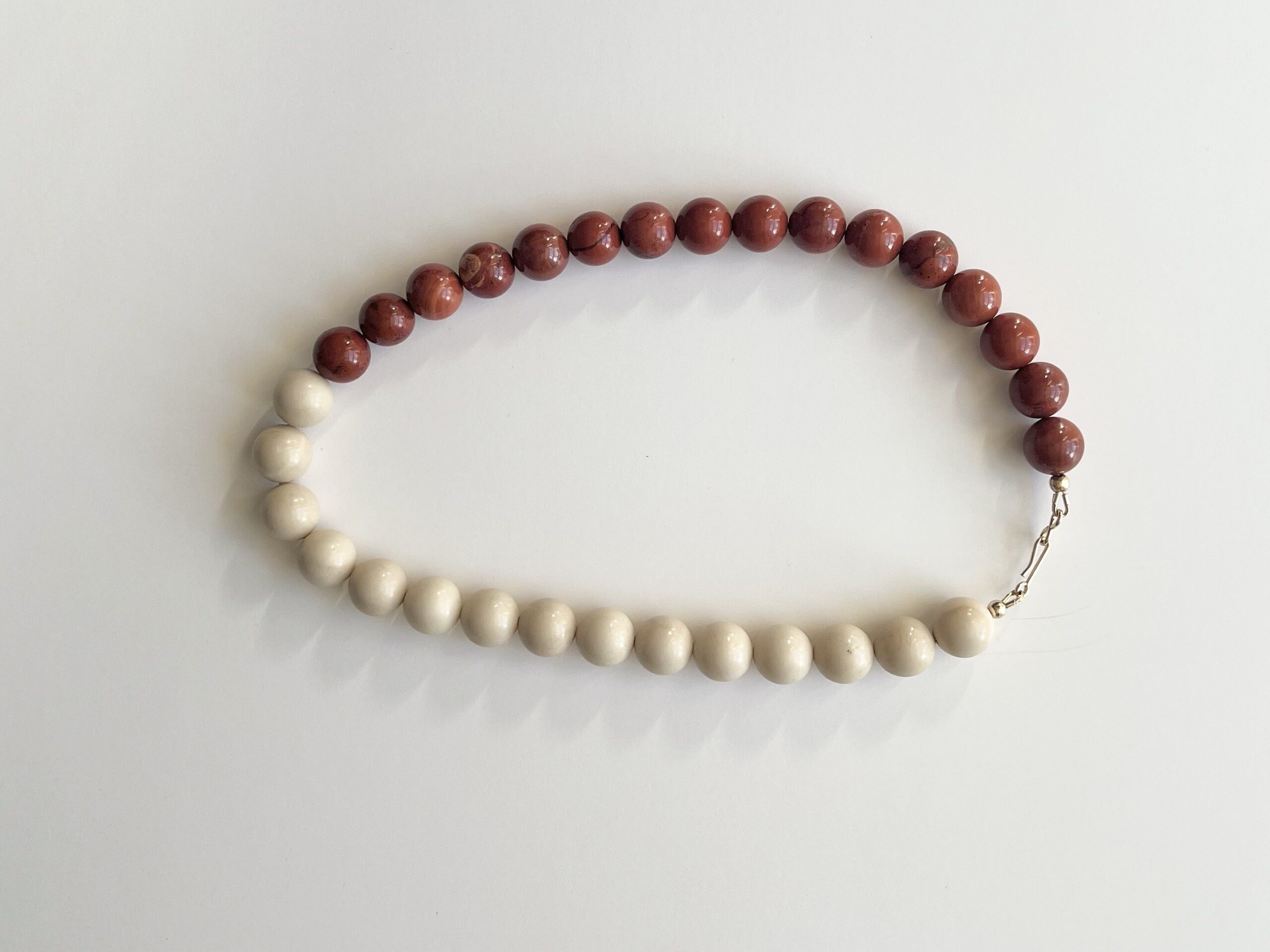 Red Jasper & Ivory Jade 12mm bead collar necklace. Length – 16.5 inch Made using gold filled hook/eye clasp and connectors. All pieces are made by hand so each is unique. Some beads may have some natural imperfections.