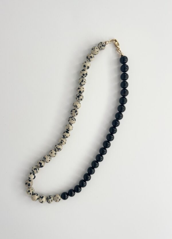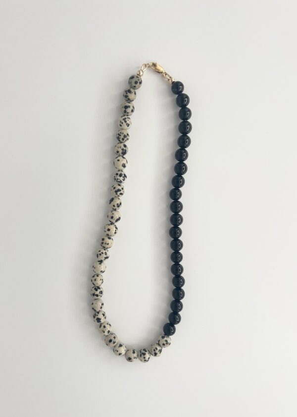 Dalmatian Jasper and Black Onyx 8mm bead necklace.
